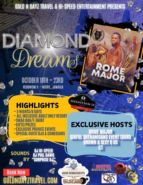 Industry veteran Rome Major (RomeMajor.com) is thrilled to announce he is slated to appear October 18-23 in Jamaica at Hedonism II in Negril for an event called “Diamond Dreams” with GoldnDayzTravel.com – a nonstop party and adults only entertainment event!